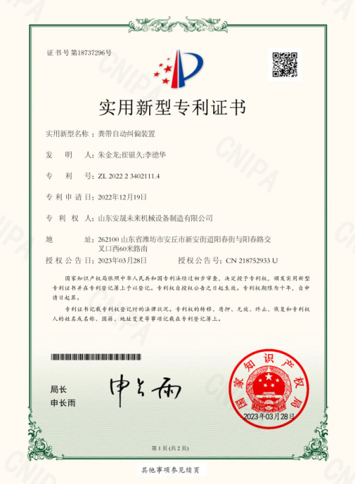 糞帶自動糾偏裝置證書